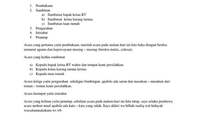Kalau sambutan panitia acara agama apakah ditambahi isi tujuan acara/bagaimana? Nov 24, 2021 · informasi contoh kata sambutan tuan rumah dalam acara rapat rt menggunakan bahasa jawa dan bahasa indonesia ringkas singkat dan praktis mudah dipraktekkan dan lazim dipergunakan oleh keluarga yang mendapat jatah arisan ketempatan kegiatan rukun tetangg rt. Contoh sambutan tuan rumah singkat 1. Berikut ini adalah contoh pidato sambutan tuan rumah bahasa jawa yang … Contoh sambutan tuan rumah bahasa jawa.